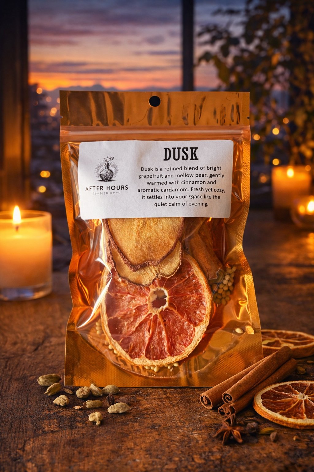 Dusk is a refined blend of bright, grapefruit and mellow pear, gently warmed with cinnamon and aromatic cardamom. Fresh yet cozy, it settles into your space like the quiet calm of evening.