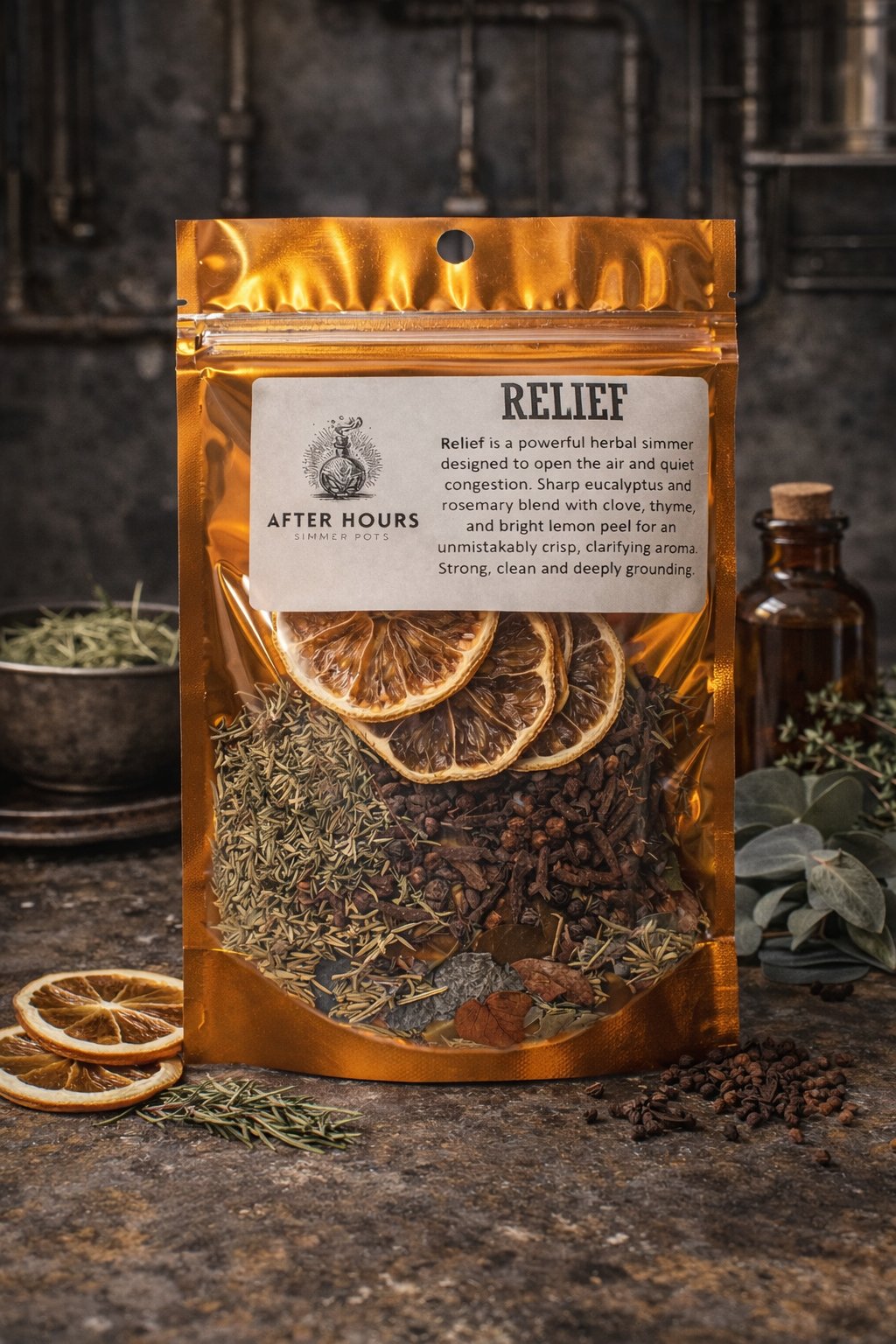Relief is a powerful, herbal simmer design to open the air and quiet congestion. Sharp eucalyptus and rosemary blend with clove, thyme, and bright lemon peel for an unmistakably crisp, clarifying aroma. Strong, clean, and deeply grounding.