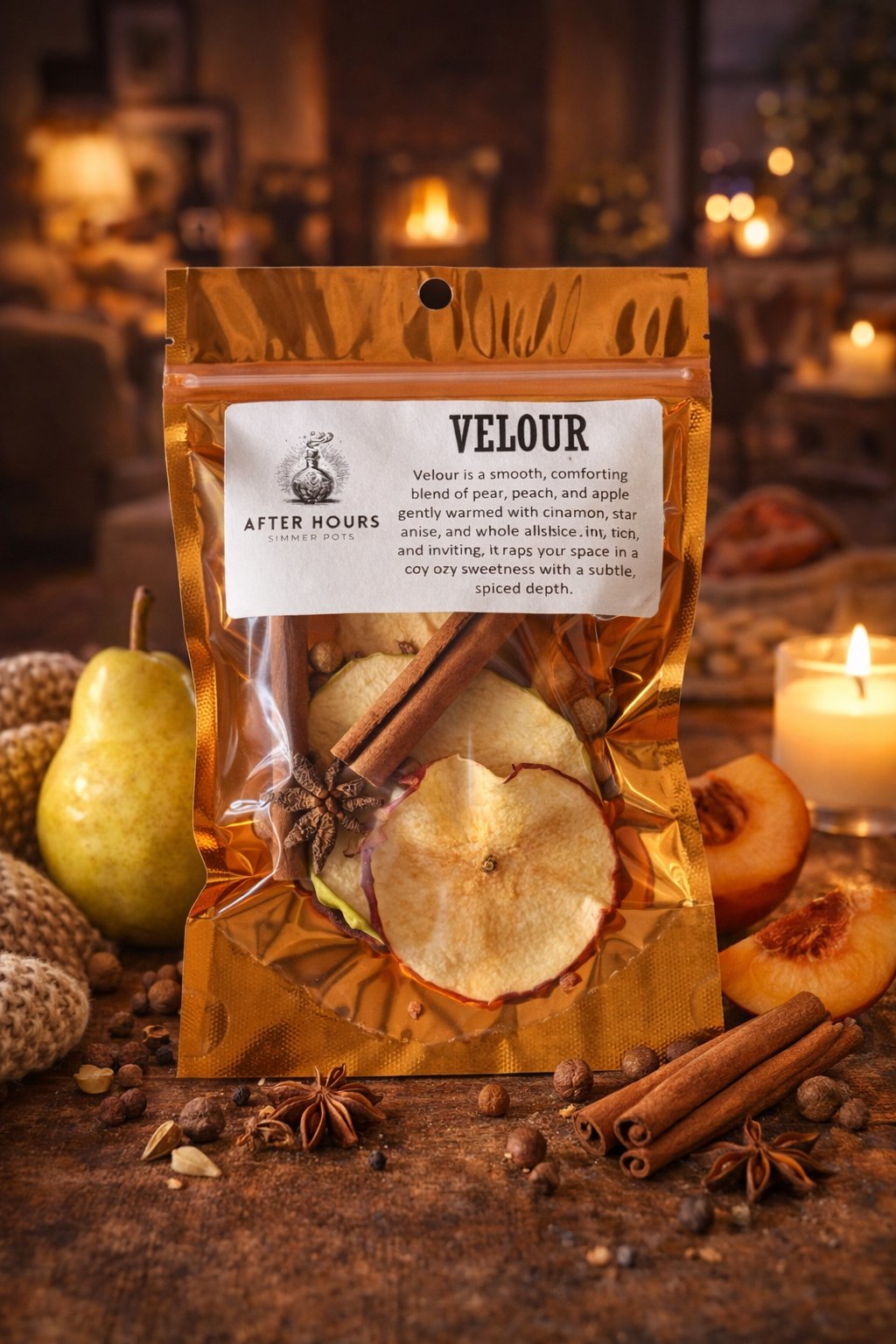 Velour is a smooth, comforting blend of pear, peach, and apple, gently warmed with cinnamon, star anise, and whole allspice. Soft, rich, and inviting, it wraps your space in a cozy sweetness with a subtle, spiced depth.